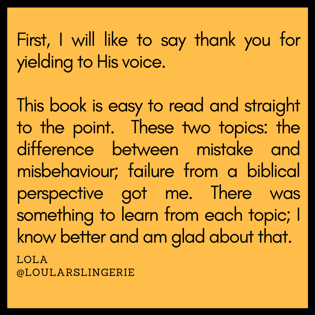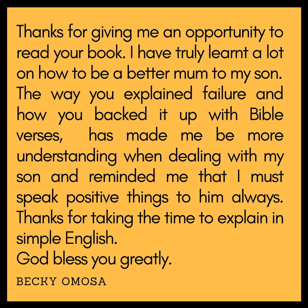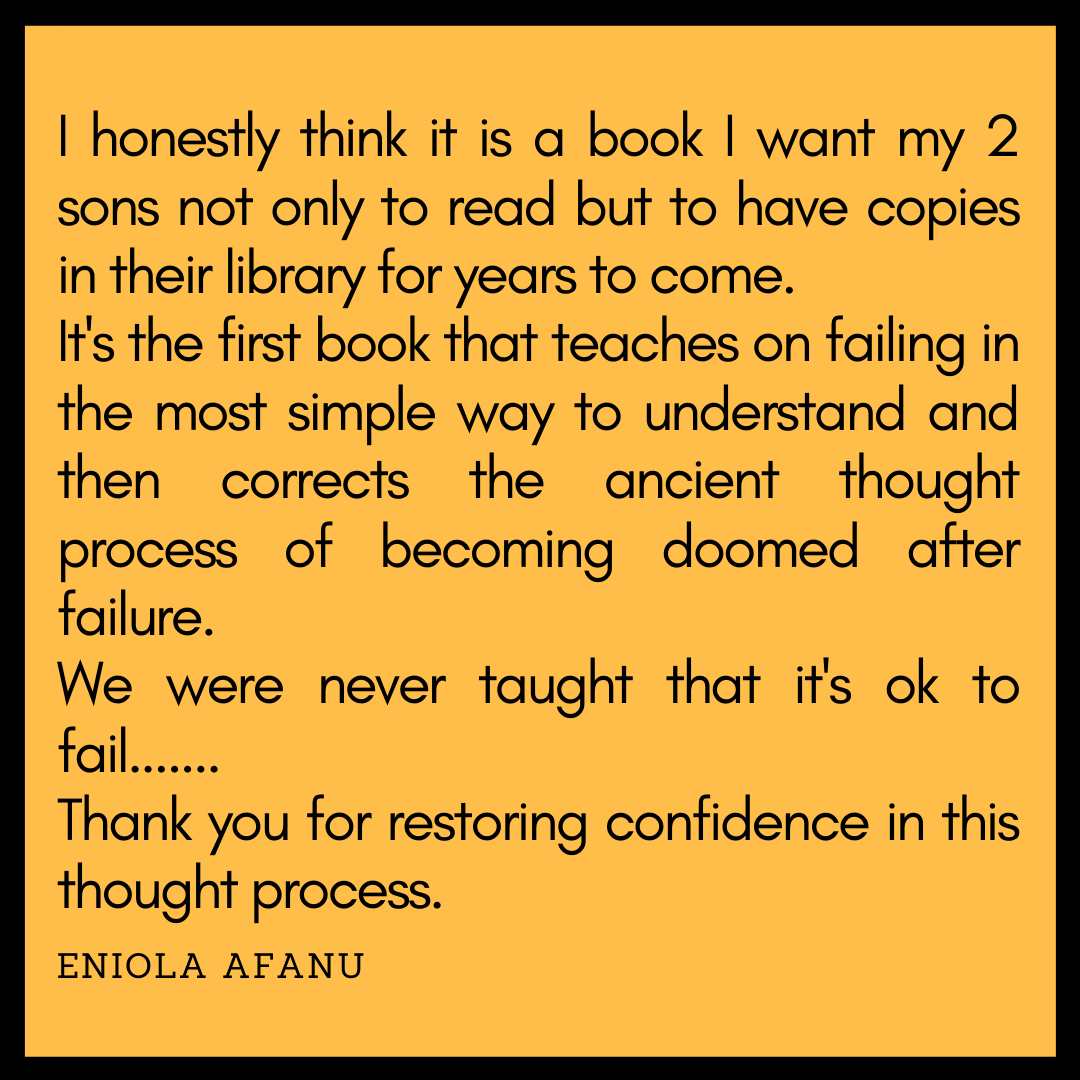 This book is for every parent and guardian who wants to properly equip their child(ren) with the skills needed to navigate through the rough waters of failure smoothly. It is a message delivered through me from God to parents, guardians and anyone with influence over children. Keep scrolling to read just a fraction of feedback I have received about this book; it is indeed a must-read. This 40-paged book could drastically change the trajectory of your life for the better, order your copy now.